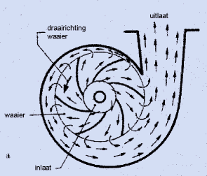 Een ventilator bestaat hoofdzakelijk uit een waaier die, gemonteerd op een as, kan draaien in een pomphuis. Door het draaien van de waaier wordt de lucht door de centrifugale kracht via de buitenomtrek van de waaier naar buiten geperst. Het uit de waaier verdrongen gas levert een zuigende werking, waardoor een even groot volume door de zuigflens weer in de waaier terecht komt. Hierdoor blijft tijdens het draaien van de waaier een continue stroming gehandhaafd. Twee grootheden die bij dit proces belangrijk zijn, zijn het debiet en het drukverschil Δ p (in Pa) over de pomp. De ventilator zuigt het gas aan de zuigzijde naar binnen, verhoogt de druk op het gas en perst het tenslotte bij die hogere druk aan de perszijde naar buiten. Hierbij veroorzaakt de ventilator een bepaalde debiet (luchtstroom). Het gedrag van een ventilator kan worden weergegeven door Δ p uit te zetten tegen V; dit wordt de ventilatorkarakteristiek genoemd.