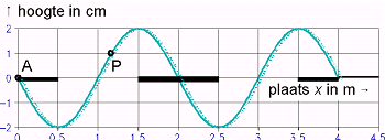 Ook hier zijn meer redeneringen mogelijk. Wat je in ieder geval moet bedenken is dat P begonnen is met omhoog te bewegen, aangezien bij het golffront een 'bult' te zien is. Ook bedenk je dat het even duurt voordat P begint, want de golf moet vanuit A eerst nog 1,17 m afleggen. Die afstand kun je nameten of schatten. Handiger is om op te merken dat P '7/12 sinus' achter loopt en dat het dus 7/12 T duurt voordat P begint. Dan zet je de 'bolletjes' en trek je de lijn.