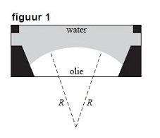a) Bepaal met behulp van figuur 1 de grootte van de straal R van het bolvormige scheidingsvlak.