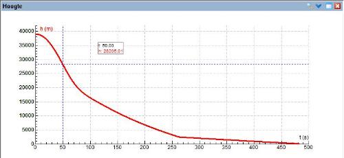 We lezen af dat op het tijdstip t = 50 s de hoogte 28205 m is. Er is dus in de eerste 50 s een afstand van 10840 m afgelegd.