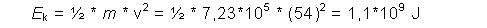 - De kinetische energie is dus: E = 0,5·m·v² = 0,5·7,22,49·105·54² = 1,1·109 J.