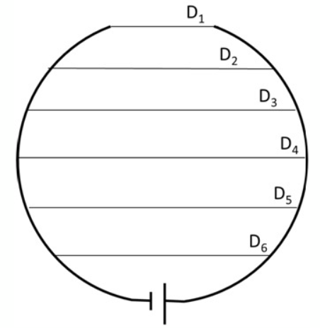 Hieronder is schematisch de bedrading van een rond scherm weergegeven. De draden hebben verschillende lengtes, maar zijn even dik en van hetzelfde materiaal.