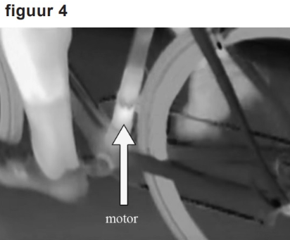 Zo’n motor kan tijdens het fietsen worden opgespoord omdat hij warmte afgeeft. Met een speciale camera worden de fietsen gefotografeerd. Zie figuur 3. De camera laat met verschillende kleuren verschillen in temperatuur op de foto zien. De warme buis rond de motor komt licht op de foto. Zie figuur 4.
