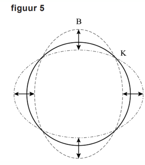 Sanne heeft een andere verklaring voor de toon. Zij denkt dat de gasfles zelf als een soort snaar werkt. Op de omtrek van de gasfles ontstaat dan een staande golf met vier knopen K en vier buiken B, net als bij een trillend wijnglas. Zie figuur 4 en schematisch in figuur 5.
