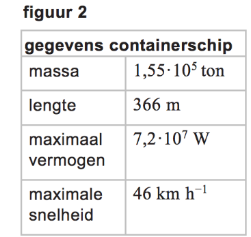 Er geldt: $P_{moter,max}=F_{moter,max}\cdot v_{max}\to 7,2\cdot 10^{7}=F_{moter,max}\cdot\frac{46}{3,6}\to $ $F_{moter,max}=5,6\cdot 10^{6}N$ . Deze motorkracht is kleiner dan de wrijvingskracht op het schip.