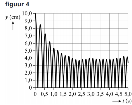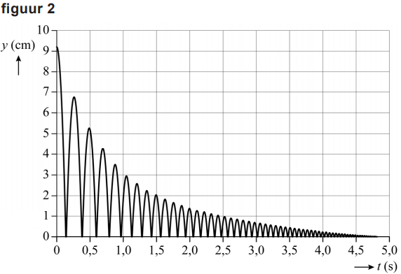 Nathalie en Karim zijn gefascineerd door de filmpjes en onderzoeken de beweging van de hydrogelballetjes. In hun eerste experiment laten ze een hydrogelballetje los vanaf een hoogte van 9,2 cm boven een koude koekenpan. Met behulp van videometen maken ze een (y,t)-diagram van de beweging van het balletje. Zie figuur 2. Hierin is y de positie van de onderkant van het balletje.