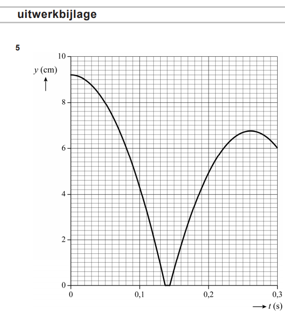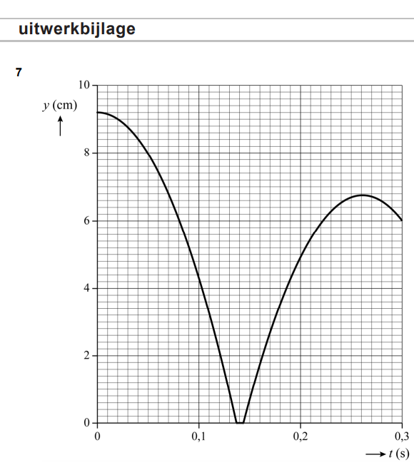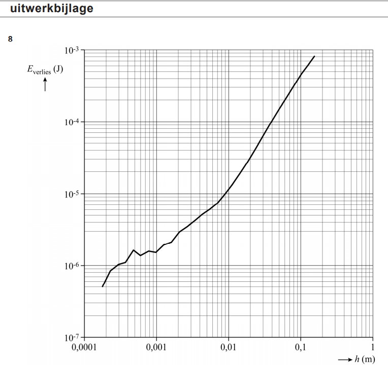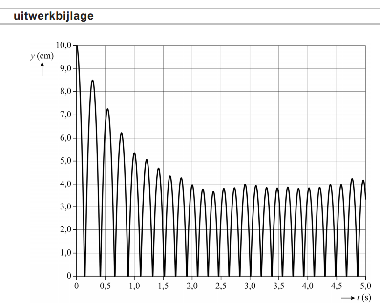 a. Bepaal met behulp van de figuur op de uitwerkbijlage het energieverlies van het balletje tijdens de eerste hele stuiterbeweging. Noteer je antwoord in twee significante cijfers.