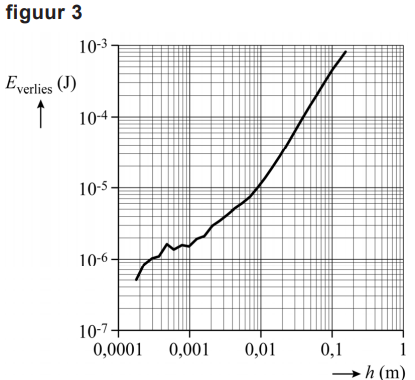Helaas blijken de metingen van Nathalie en Karim te onnauwkeurig om te bepalen wat de oorzaak van het energieverlies is. Onderzoekers in Leiden hebben het gedrag van de hydrogelballetjes ook onderzocht. Om het energieverlies nauwkeurig te kunnen bepalen hebben zij de stuiterbeweging gefilmd met een hogesnelheidscamera. Ze lieten de balletjes van verschillende hoogtes vallen op een koude koekenpan. Bij elke valhoogte $h$ bepaalden zij hoe groot het energieverlies is bij één stuiterbeweging. Zie figuur 3.
