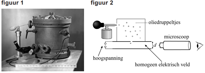 In 1909 voerden Robert Millikan en Harvey Fletcher een experiment uit waarmee ze de lading van het elektron bepaalden. In figuur 1 staat een opstelling voor dit experiment afgebeeld. In figuur 2 is de opstelling schematisch weergegeven. In het bovenste gedeelte wordt olie verneveld tot kleine druppeltjes. De druppeltjes krijgen met behulp van ioniserende straling een lading. Door een kleine opening in de bovenste van twee platen kunnen enkele druppels omlaag vallen in het onderste gedeelte. Tussen deze platen kan een homogeen elektrisch veld gecreëerd worden door een spanningsbron aan te sluiten op de platen. Wanneer daar geen spanning over staat, vallen de druppels naar beneden. Als er wel een spanning staat kunnen de druppels ook omhoog bewegen. Tijdens het experiment lieten Millikan en Fletcher een druppel een aantal keren op en neer bewegen.