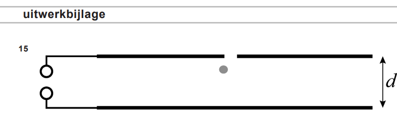 i) Teken in de figuur op de uitwerkbijlage het elektrisch veld tussen de platen. Gebruik daarbij minimaal vijf veldlijnen.