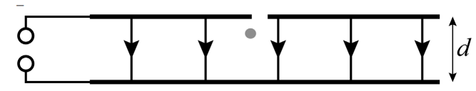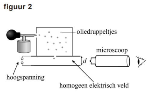 Door de ioniserende-stralingsbron ontstaan er in het bovenste gedeelte van de opstelling vrije elektronen in de lucht. Deze elektronen hechten aan de oliedruppel, waardoor de druppel een lading krijgt. Om het homogene elektrisch veld te maken wordt een spanning aangesloten tussen de platen. Zie figuur 2. Voor de elektrische veldsterkte tussen de platen geldt: