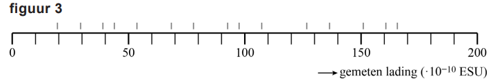 Millikan heeft op deze manier de lading voor veel verschillende druppels bepaald. Hij kwam erachter dat de lading elke keer een veelvoud van hetzelfde getal was. Dit getal is het elementair ladingsquantum. In figuur 3 staat de lading van 15 verschillende druppels op een horizontale as. De streepjes boven de as geven de verschillende metingen aan. Je mag aannemen dat het elementair ladingsquantum uit deze metingen te bepalen is. In 1909 drukte men de lading standaard uit in ESU. Er geldt: $1 ESU=3,34\cdot 10^{-10}\,C$ .