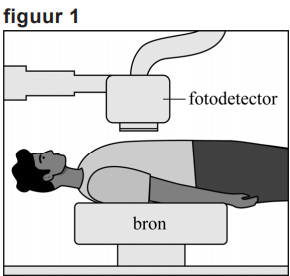 Voor een bepaald medisch onderzoek is het nodig om de lever van een patiënt in beeld te brengen. Dit kan onder andere met röntgenstralen. De patiënt ligt dan boven een röntgenbron en boven de patiënt bevindt zich een fotodetector die meet hoeveel röntgenstraling er door de patiënt heen gaat. Dit is schematisch weergegeven in figuur 1.