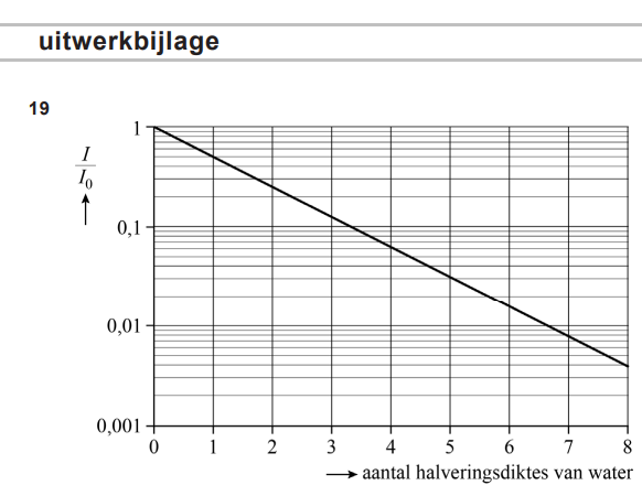 Op de uitwerkbijlage staat een grafiek waarin voor water de doorgelaten stralingsintensiteit ten opzichte van de opvallende intensiteit van de röntgenstraling is uitgezet tegen het aantal halveringsdiktes van water.