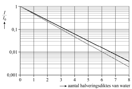 gebruik van $d_{\frac{1}{2},\mathrm{leverweefsel}}=0,9\cdot d_{\frac{1}{2},\mathrm{water}}$ en tekenen van de grafiek voor leverweefsel, met eindpunt tussen $\frac{I}{I_{0}}=0,002$ en $\frac{I}{I_{0}}=0,003$ | 1 punt |