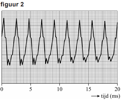 a. Bepaal met behulp van figuur 2 de laagste frequentie van deze toon. Noteer je antwoord in drie significante cijfers.