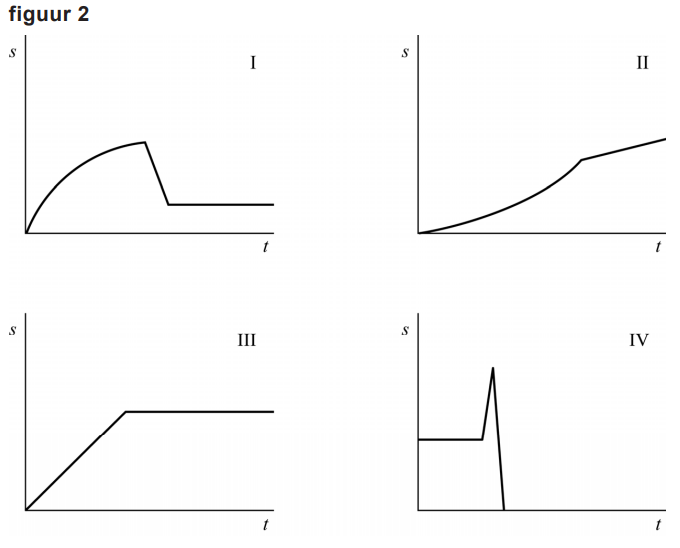 Basejumpen is een manier om te ontsnappen. Basejumpen is parachutespringen van lage hoogte, zoals van een gebouw. Na een korte vrije val opent de parachute. In figuur 2 zijn vier diagrammen weergegeven waarin de afgelegde afstand s is uitgezet tegen de tijd t.