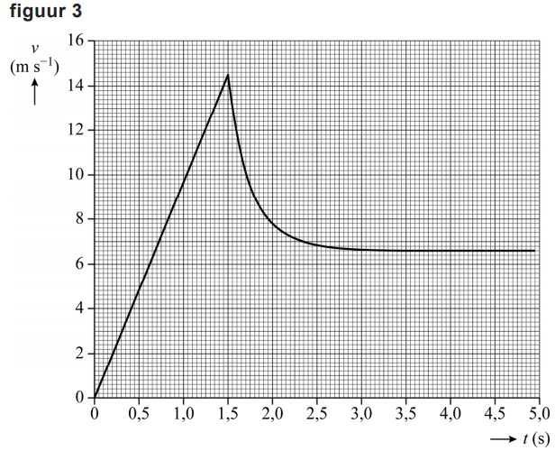 De figuur 3 staat ook op de uitwerkbijlage. Een menselijk lichaam kan veilig blootgesteld worden aan een versnelling van maximaal $60ms^{-2}$ direct na het openen van de parachute.