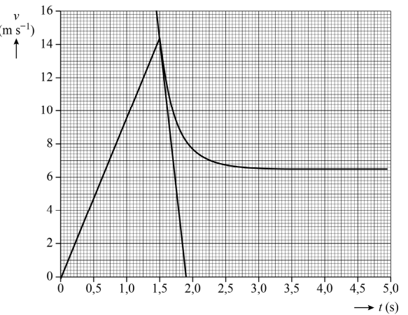 tekenen van een raaklijn direct na t = 1,5 s of gebruik van een relevant recht deel in de grafiek | 1 punt |