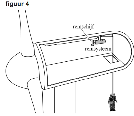 Een basejump kan gevaarlijk zijn. Daarom is er ook een systeem ontwikkeld om met een constante snelheid af te dalen aan een staalkabel. Om deze snelheid constant te houden, wordt er continu geremd door een remsysteem met een remschijf. Dit remsysteem is boven in de windmolen bevestigd. Zie figuur 4.