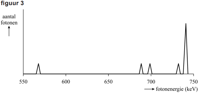 De gammafotonen die vrijkomen bij verval van Cs-137 hebben een golflengte van $1,875\cdot 10^{-12}m$ . Om te bepalen of er Cs-137 in de kubus aanwezig is, hebben de onderzoekers gemeten hoeveel gammafotonen de kubus uitzendt bij verschillende foton-energieën. Het resultaat hiervan staat in figuur 3.