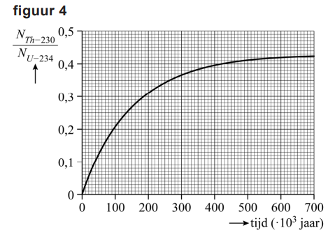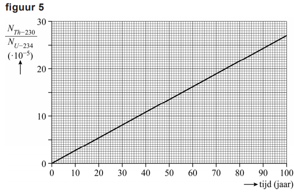 Omdat er van nature een kleine hoeveelheid U-234 aanwezig is in uranium, konden de onderzoekers dit gebruiken om de leeftijd van de kubus te bepalen. Dat deden ze door het verloop van de hoeveelheid U-234 en het vervalproduct Th-230 sinds de productie van het uraniumblokje te modelleren. Het model gaat ervan uit dat Th-230 alleen afkomstig is vanuit het verval van U-234. In figuur 4 is het resultaat te zien. Op de verticale as staat de verhouding tussen het aantal kernen van Th-230 en van U-234. Op de horizontale as staat de tijd sinds de productie van het uraniumblokje.
