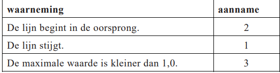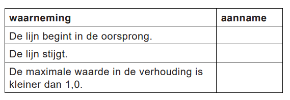 Op de uitwerkbijlage staat een tabel met enkele waarnemingen over de grafiek in figuur 4. Bij elke waarneming hoort een van de aannames (1, 2 of 3).