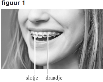 Met een beugel kan de stand van tanden aangepast worden. Langs de tanden wordt een draad gespannen die via een slotje tegen de tanden drukt. Zie figuur 1.