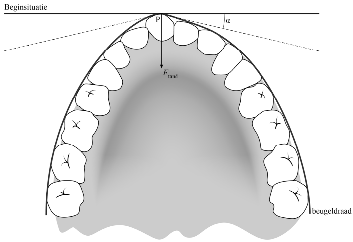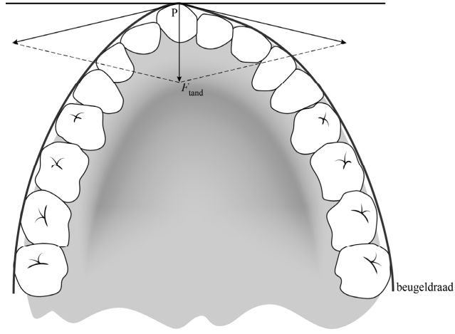 Kracht $F_{tand}$ op de tand wordt kleiner met het naar binnen bewegen van de tand.