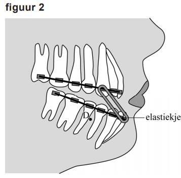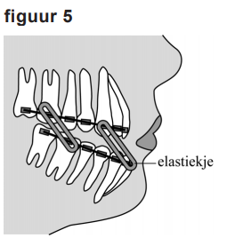 Een beugel wordt ook gebruikt om de stand van de kaak aan te passen. Om ervoor te zorgen dat de boven- en onderkaak goed op elkaar aansluiten, worden de boven- en onderkaak door elastiekjes met elkaar verbonden. Zie figuur 2.
