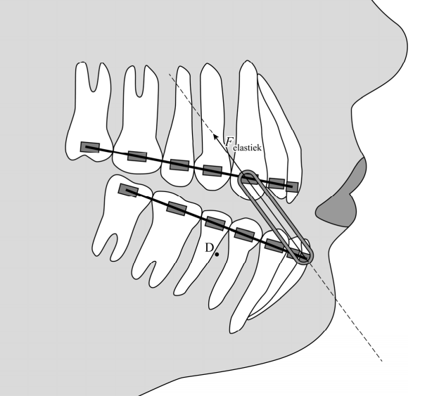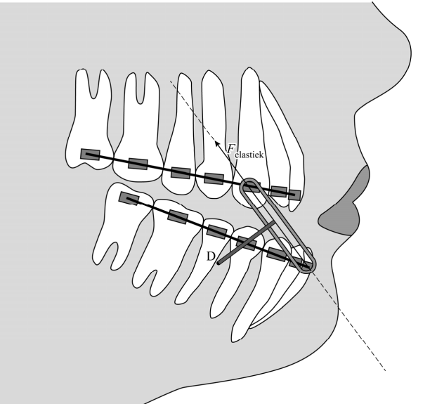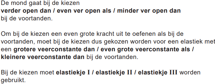 Om bij de kiezen een even grote kracht uit te oefenen als bij de voortanden, moet bij de kiezen dus gekozen worden voor een elastiek met een grotere veerconstante dan bij de voortanden.