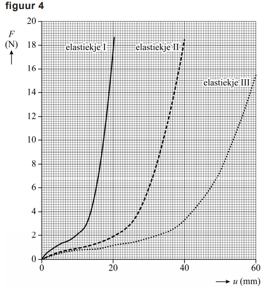 Bij een bepaalde beugel worden op twee plekken elastiekjes geplaatst: één bij de voortanden en één bij de kiezen. Er kan gekozen worden uit verschillende elastiekjes. In figuur 4 staat het (F,u)-diagram van drie verschillende elastiekjes.