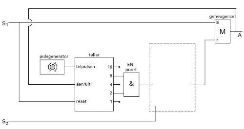 Bij het openen van een deur van deze auto gaat de binnenverlichting aan. Na het sluiten van de deur gaat de binnenverlichting niet meteen uit. Dit gebeurt pas na enige tijd. Hiervoor gebruikt men een schakeling met verwerkers. Zie figuur 1. Het ingangssignaal bij S1 is alleen hoog bij geopende deur. De binnenverlichting brandt als het uitgangssignaal in A hoog is.