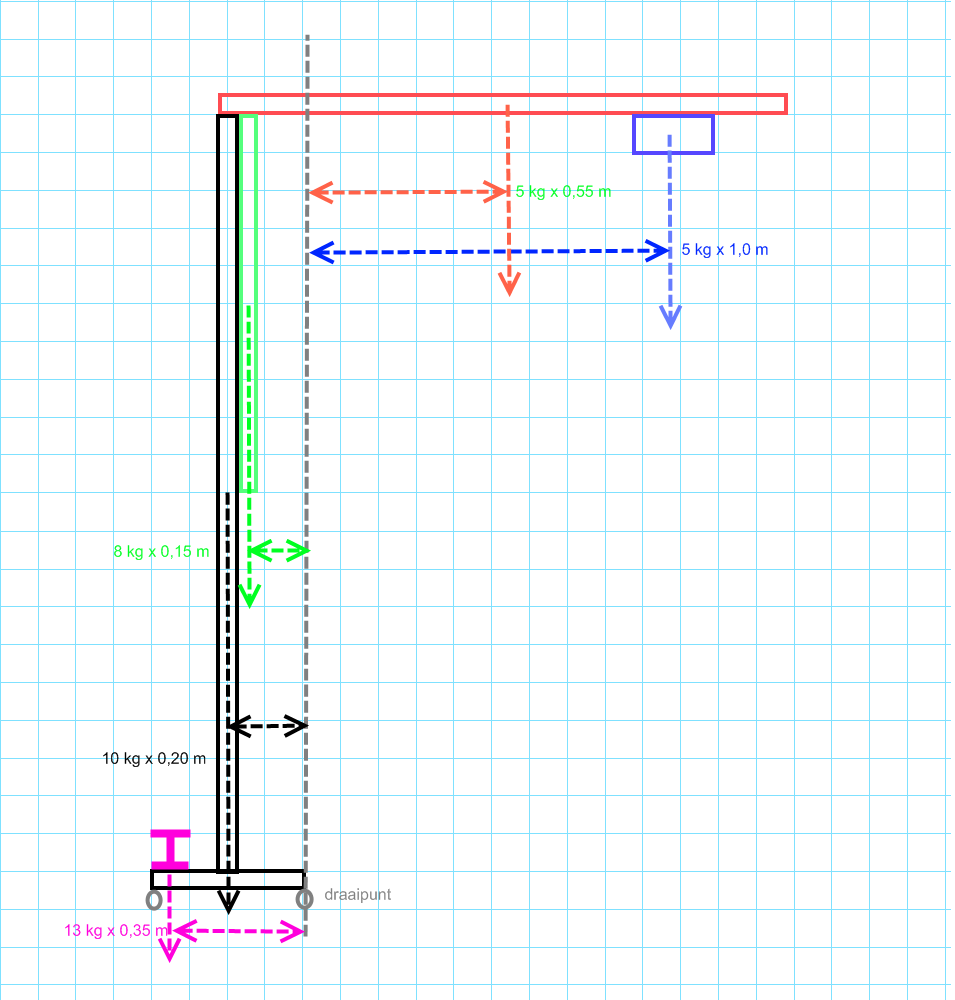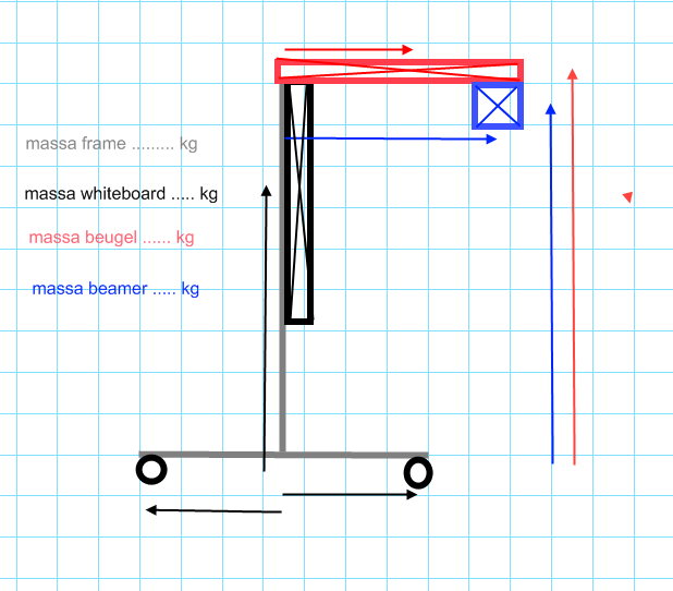 Kun je in het bijgevoegde plaatje even de massa's van de onderdelen invullen, en de afstanden bij de pijltjes zetten?