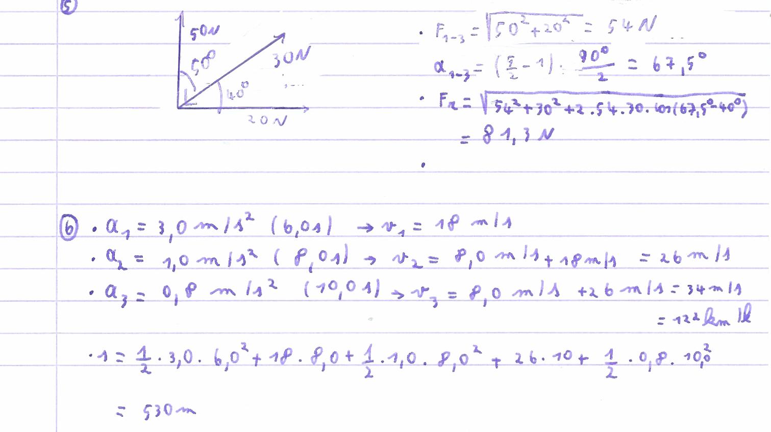5. Drie krachten liggen in hetzelfde vlak en werken in op een massa m. Degrootte van de drie krachten is respectievelijk 20 N, 30 N en 50 N. De hoektussen de eerste en de tweede kracht is 40°, die tussen de tweede en dederde kracht bedraagt 50°, telkens in wijzerzin gemeten (krachten 1 en 3staan dus loodrecht op elkaar). Bepaal de grootte en de oriëntatie van de