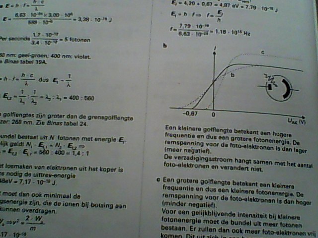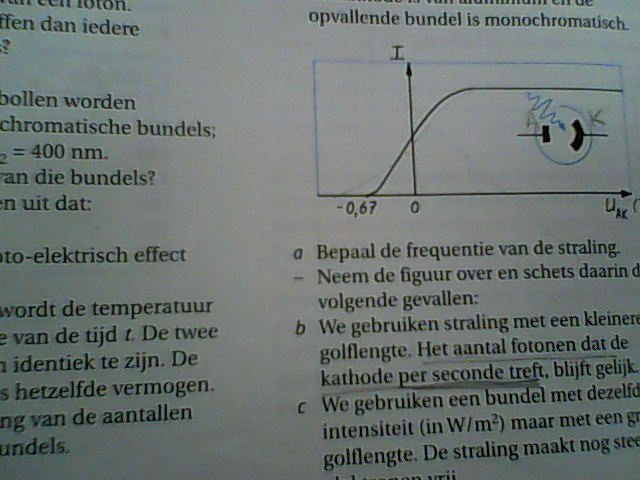 Bedankt! Maar dan zit ik nog steeds met het probleem dat bij U=0 de zwarte lijn en de lijn van b elkaar snijden. Als de elektronen meer energie hebben, hebben ze een grotere kans de kathode te treffen (fotonen energie groter). Als de elektronen minder energie hebben, hebben ze dus een kleinere kans de kathode te treffen. Waarom zijn snijden ze elkaar hier als de verzadigingsstroom nog niet is bereikt?