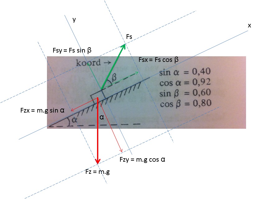 Gegeven: sin a=0,40 - cos a=0,92 - sin b =0,60 - cos b =0,80.        Met a = hellingshoek en b= hoek dat het koord malt tov het vlak (zie afb)