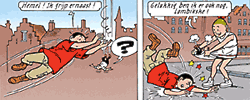 Echter, Suske is op dat ogenblik nog met een beweging naar boven bezig, of dan toch op zijn best ergens bovenin de parabool die hij beschrijft en dus met een zeer geringe verticale snelheid, terwijl Lambiek kennelijk van zeer hoog verticaal naar beneden vallend op dat ogenblik een grote verticale snelheid naar beneden moet hebben.
