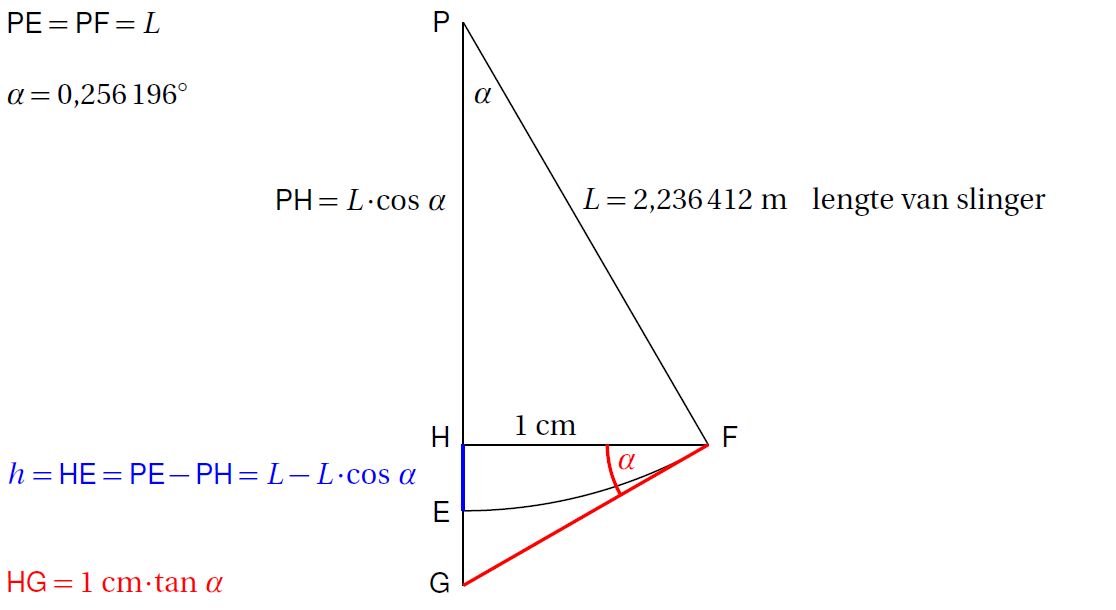 a. In Theo's rechter figuur is h langs de verticaal door het ophangpunt van de slinger en is 1 cm horizontaal, loodrecht op h. Zodoende lijkt de figuur 'onderste boven'. Dat mag natuurlijk.