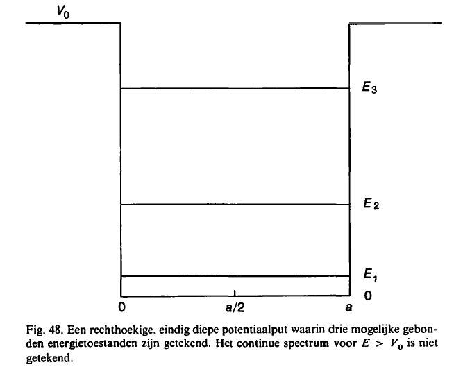 Tekenen we "de potentiaalput" waarin het deeltje zich bevindt dan is het laagste energieniveau E1 van dit deeltje (langs de Y-as die de energie weergeeft) dus ook niet op de bodem van de put (E=0 J) maar iets erboven. Het volgende energieniveau van het deeltje zal hoger liggen: E2 en meer.