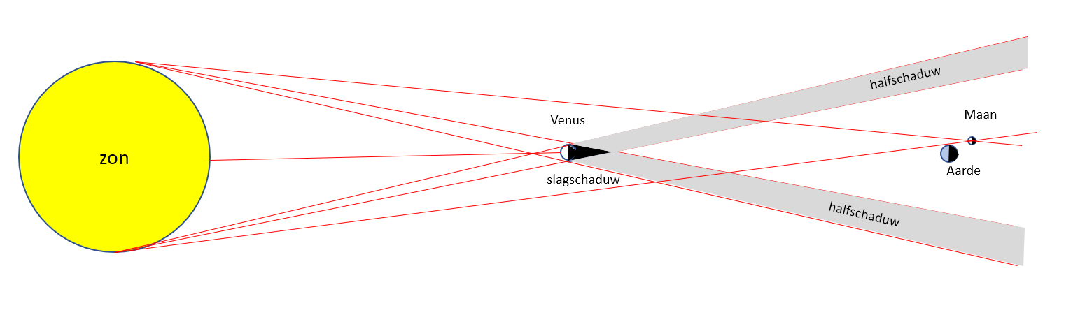 Dus dan ga je nu eens een schets moeten maken, zoiets als die van Theo, driehoeksmeetkunde, bekende afstanden en diameters moeten opzoeken, en dan bedenken waar je Venus en/of de maan heen wil schuiven t.o.v. de zon om de maan binnen de kernschaduw van Venus te krijgen.