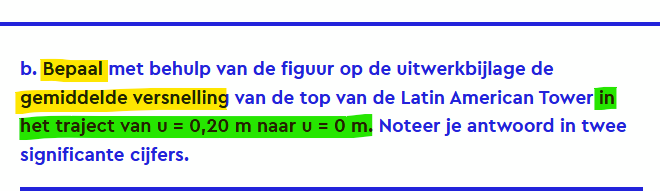 Bij vraag 23 moet je de gemiddelde versnelling bepalen 'in het traject van $~u=0,20\text{~m}$ naar $~u=0\text{~m}$'. Hiervoor gebruik je straks