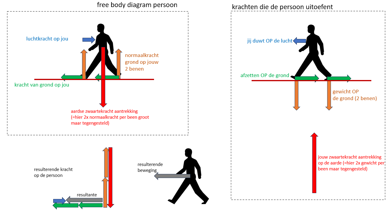 Onderstaand heb ik het nog eens proberen te tekenen. Voornaamste voor beweging is het free body diagram van de persoon. De resultante kun je bepalen via meermalen de parallellogrammethode te gebruiken of telkens een krachtvector pijlpunt tegen een krachtvector achterkant te leggen. Hier heb ik ze een beetje naast elkaar getekend om aan te geven hoe sommige krachten elkaar opheffen.