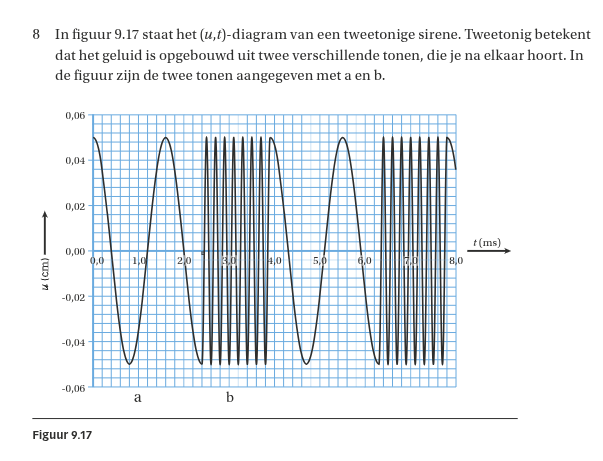 Wat zich bij de sirene herhaalt, bestaat uit de delen a en b samen. Deel a is een lage toon en b is een hoge toon. De tijdsduur van a en b samen is van $t=0\,\text{ms}$ tot $t=3,9\,\text{ms}$.