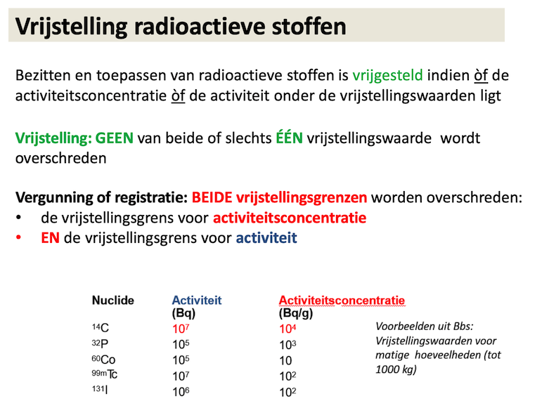 - Je moet rekening houden met de sommatieregel; indien de gewogen gesommeerde activiteit (bronactiviteit gedeeld door vrijstellingsactiviteit) van meerdere vrijgestelde bronnen groter is dan 1, is alsnog een vergunning noodzakelijk (de activiteitsconcentratie zit voor puntbronnen (en dat zijn juist de bronnen die gebruikt worden tijdens een practicum) altijd boven de vrijstellingswaarde). Dit is in de praktijk heel vaak het geval, tenzij je een enkel vrijgesteld bronnetje hebt (er zijn radionucliden met weinig risico waar je er meer van zou mogen hebben voordat je met de sommatieregel boven de vrijstellingsgrens komt).