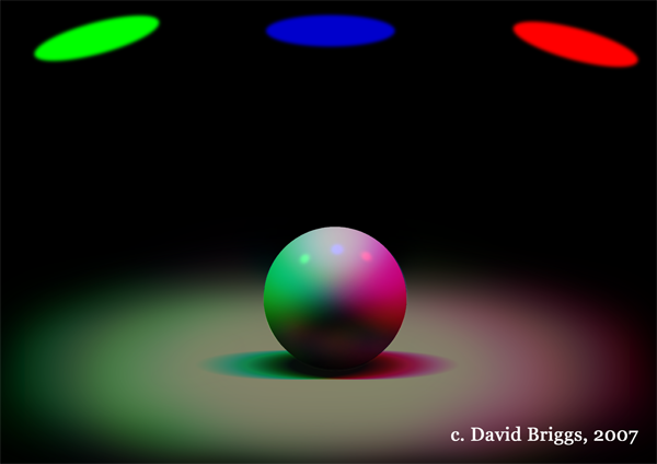 Het is eigenlijk wat meer werk om de oorspronkelijke vraag goed te beantwoorden. Je zou een foto kunnen maken van een modelautootje onder twee ledlampen. Of je kunt gaan met een computerprogramma voor raytracing een render gaan doen van zo'n scene. Hier een glimmende witte biljardbal under een groene, een blauwe en een rode lamp (bron: http://www.huevaluechroma.com/011.php). Ik heb nog even gezocht of Briggs ook een plaatje had zonder die blauwe lamp, maar niet gevonden.