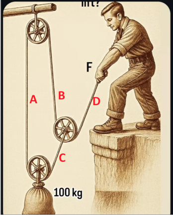 Je vertelt niet hoe de vraag bij deze afbeelding letterlijk luidt, maar als dat iets is als "bereken de kracht waamee de man moet trekken" dan is die onmogelijk te beantwoorden.