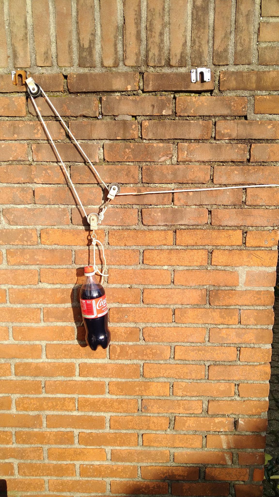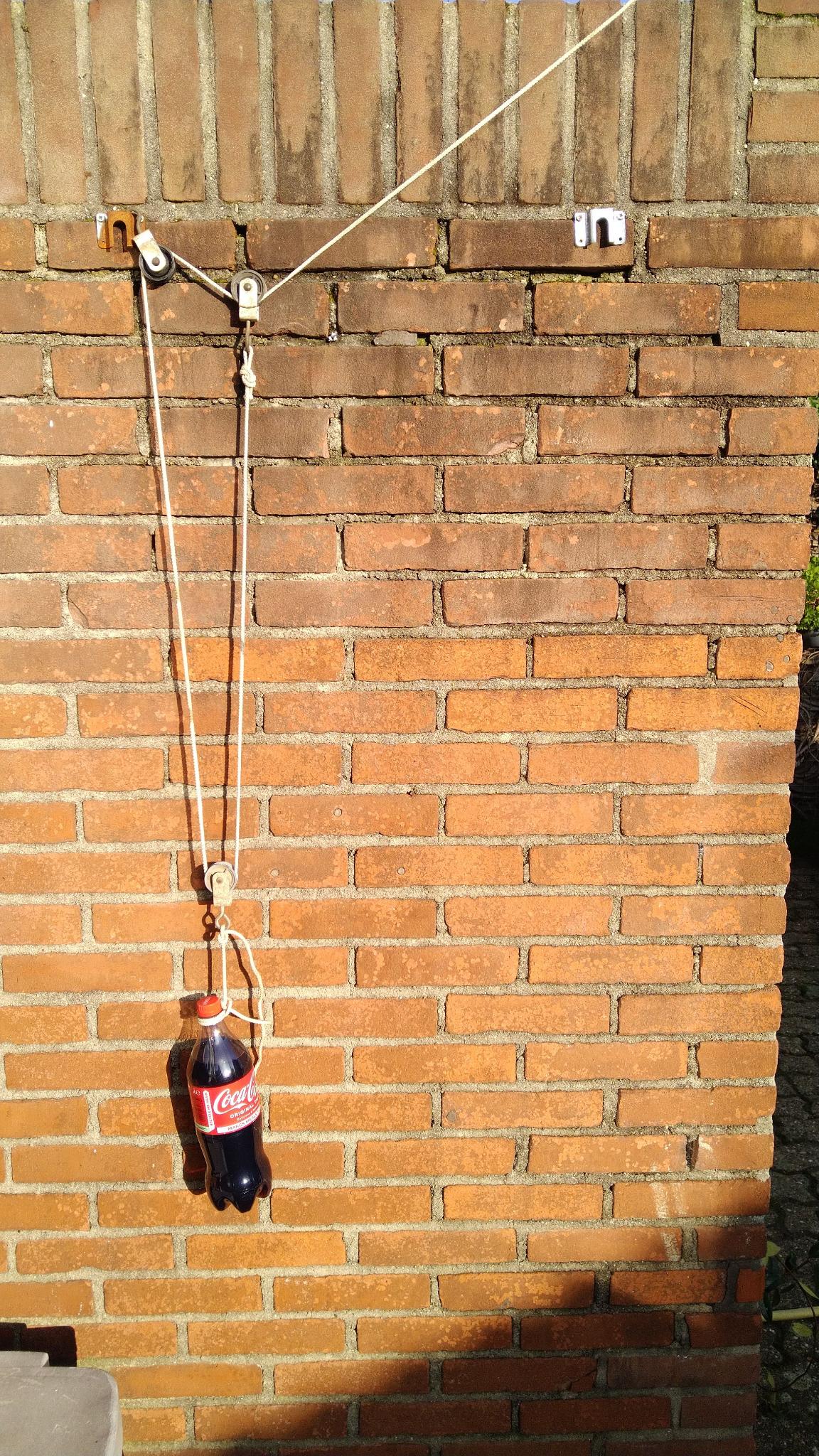 Ik bedachte me dat ik in de schuur nog ergens een stelletje katrolletjes had liggen. Met een beetje siliconenspray kreeg ik die redelijk wrijvingsarm draaiende.