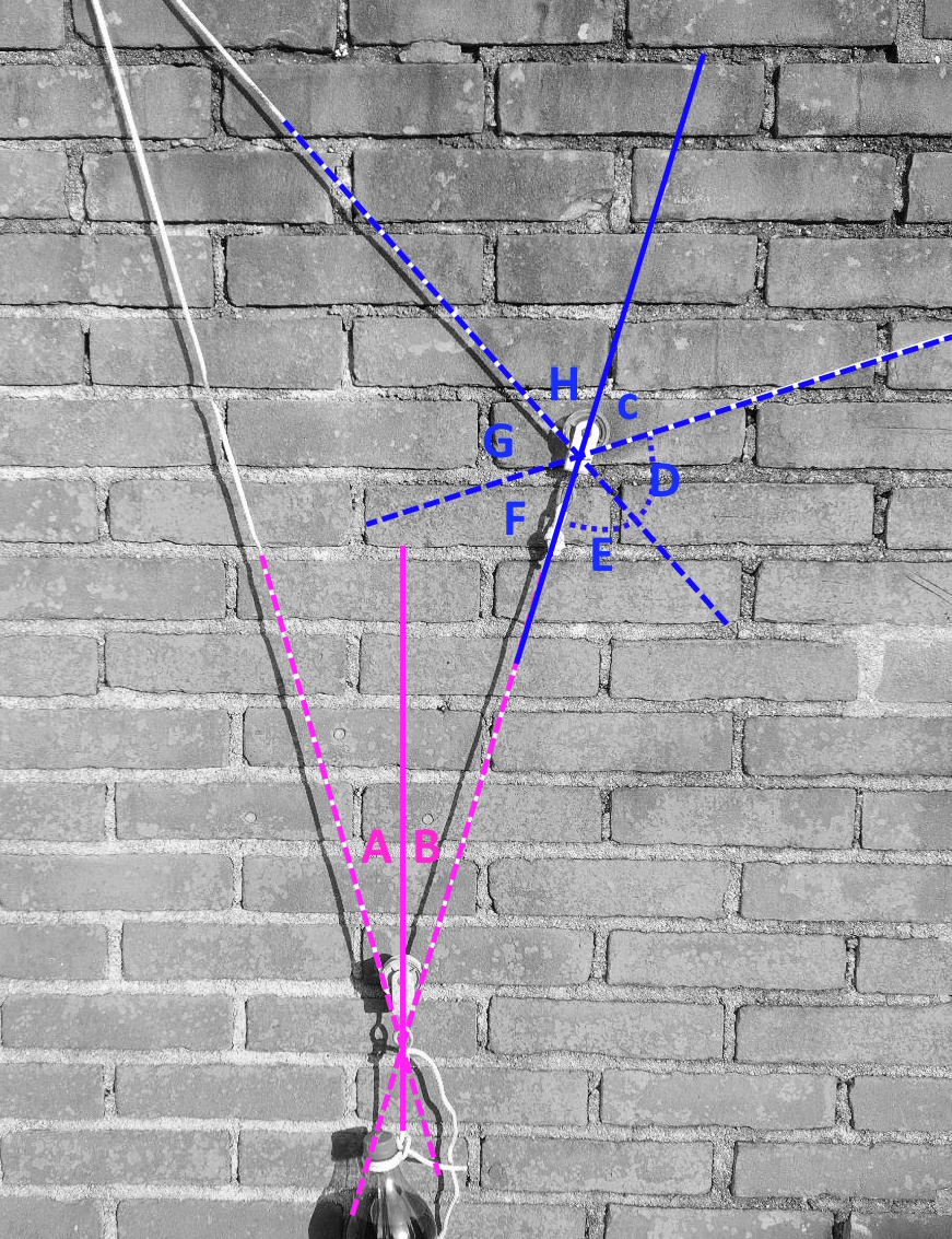 a. Je schreef om 10.28 uur: 'Laten we ervan uitgaan dat het allemaal precies verticaal hangt.' Goed, afgesproken. Want als de touwdelen B,C,D (figuur van 12.57 uur) schuin zouden zijn, gaan er een paar dingen naar rechts bewegen, schuin of opzij. Dat mag niet volgens de eis van 'goede werking'.