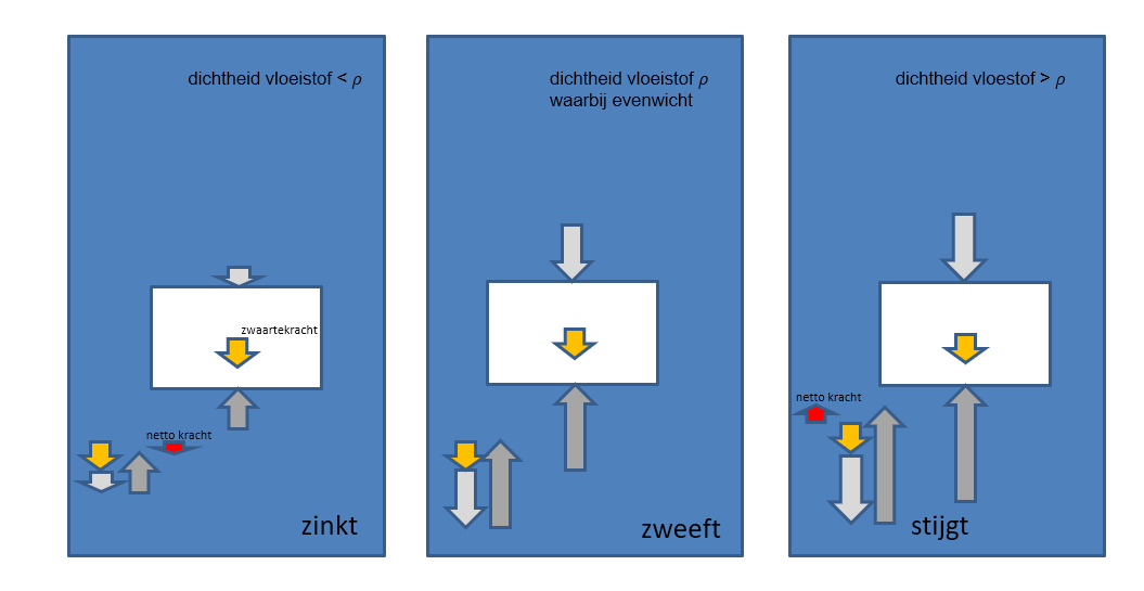 (onderstaand figuur geeft aan wat voor krachten op volledig ondergedompeld voorwerp werken. De stijgende zal het voorwerp doen drijven. Het deel in de vloeistof heeft dan dezelfde opwaartse kracht als diens zwaartekracht)